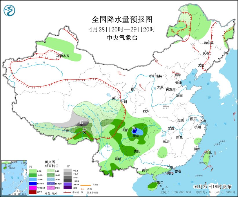 4月28日20时至29日20时,青海中南部、西藏中东部、川西高原北部等地部分地区有小到中雪或雨夹雪,其中,西藏东北部局地有大到暴雪(10~15毫米)。新疆北疆沿天山地区、内蒙古东部、黑龙江西部、湖北西南部、湖南西部、西南地区大部、广西南部、广东南部、西藏东南部等地部分地区有小到中雨,其中,重庆西南部等地有大到暴雨(50~70毫米)。内蒙古大部、华北西部和北部等地部分地区有4~6级风(见图2)。