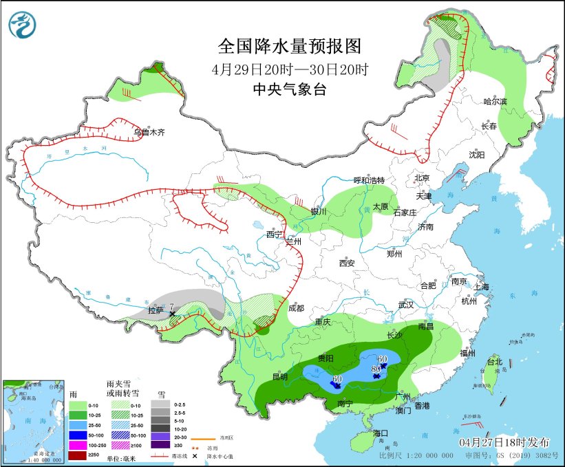 4月29日20时至30日20时,内蒙古东北部、西藏东部、川西高原中部等地部分地区有小到中雪或雨夹雪,局地大雪。江西中南部、湖南南部、广东西部、广西大部、贵州南部、云南东南部等地部分地区有中到大雨,其中,广西北部、湖南南部局地有暴雨(50~80毫米)。内蒙古等地部分地区有4~6级风(见图3)。