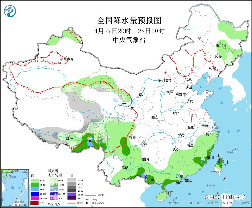 4月27日20时至28日20时,青海西部和南部、甘肃河西、吉林东部、西藏东部和南部、川西高原中北部等地部分地区有小到中雪或雨夹雪。黑龙江北部、吉林中部、江南中南部、华南大部、四川西部和南部、贵州西部、云南大部、西藏东南部等地部分地区有小到中雨,其中,广西西南部、福建东南部、台湾岛北部等地部分地区有大雨(25~45毫米)。甘肃河西、内蒙古中东部、辽东半岛、山东半岛、苏皖中北部等地部分地区有4~6级风(见图1)。